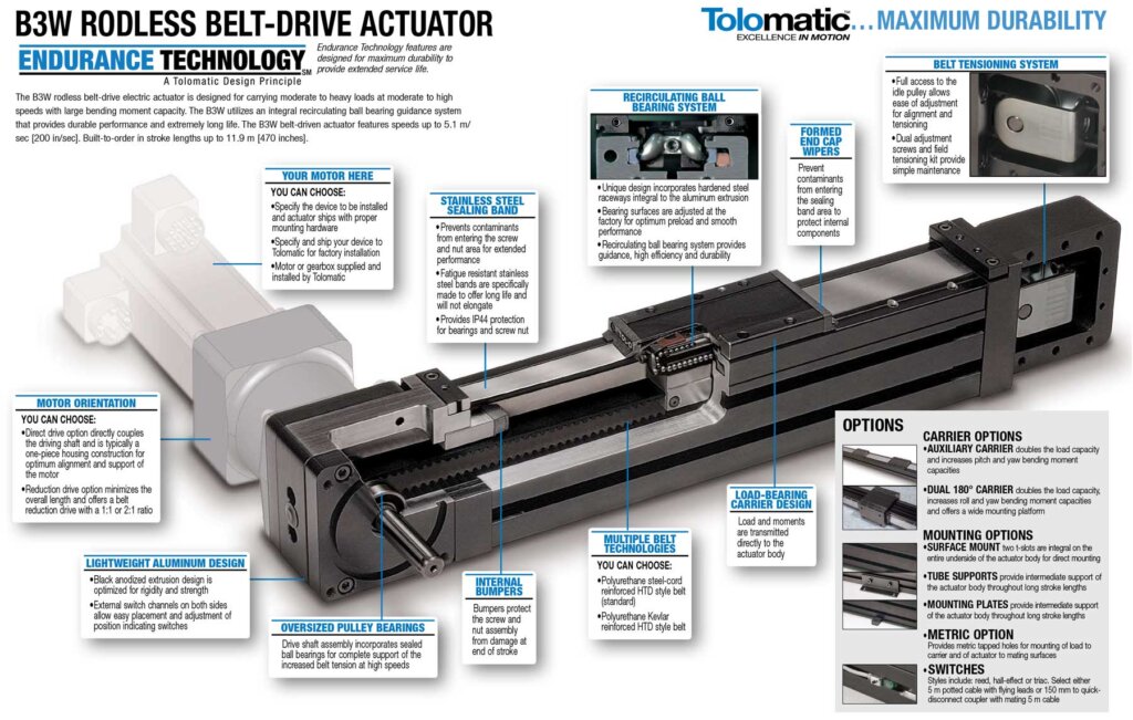 Tolomatic’s B3W is a linear belt driven rodless actuator series that has a enclosed carrier support bearing design that provides long life and high load capability. The bearings and belt are protected by a stainless steel dust band that provides a IP44 rating against dust and debris. The B3W is the ideal choice for tough environments, especially those with high amounts of particulate and require long operating life.
