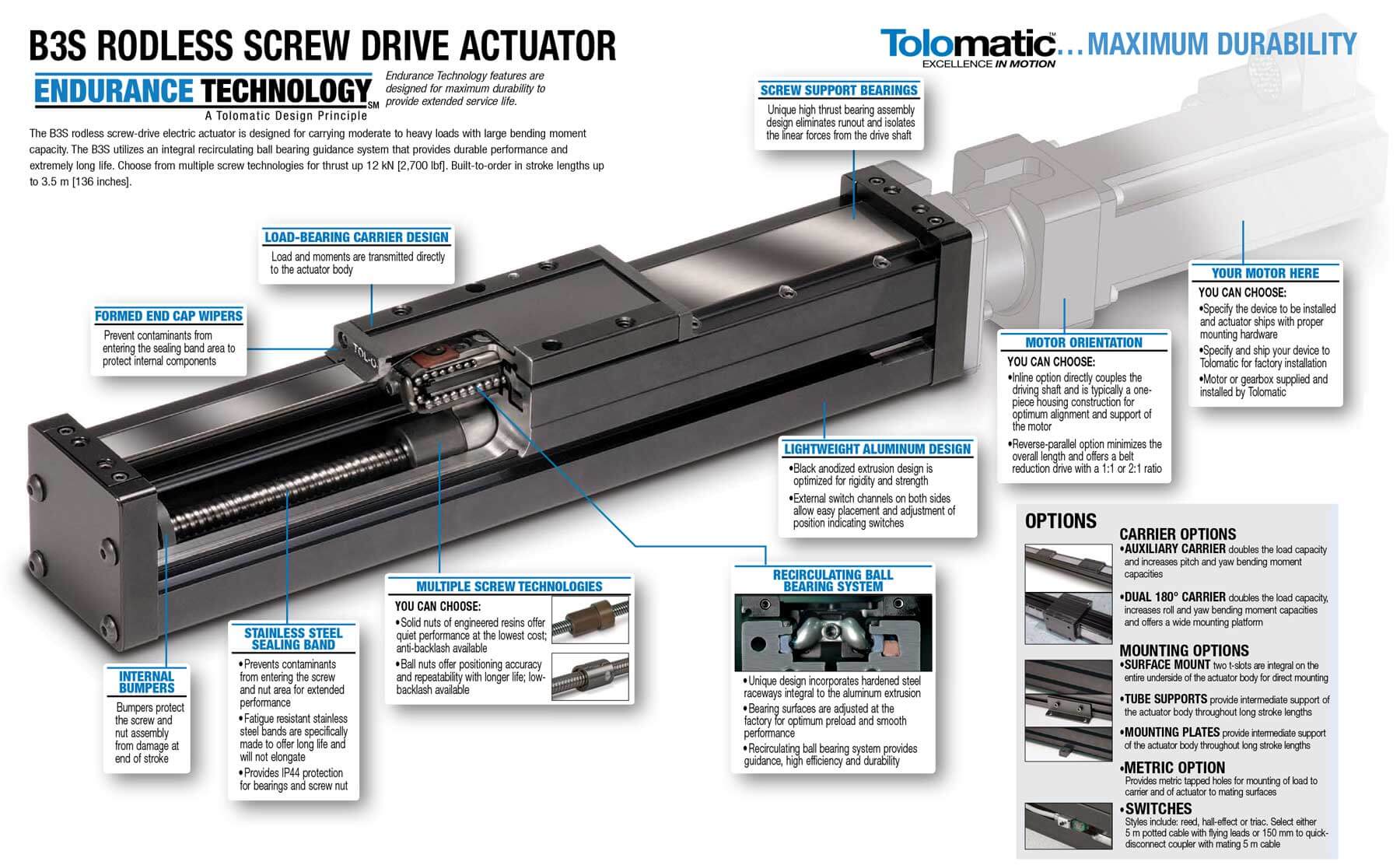 Der B3S Kugelgewinde- Linearantrieb ist in der Lage, bei gleichbleibender Laufruhe hohen Lasten und Biegemomenten standzuhalten. Die B3S Kugelgewinde-Linearantriebe verfügen über geschlossene Kugelumlaufführungen , wodurch die Verwendung einer externen Lastführung überflüssig wird. Der B3S Kugelgewinde-Linearantrieb bietet eine hohe Wiederholgenauigkeit und einen Arbeitszyklus von 100 % mit langer Lebensdauer.