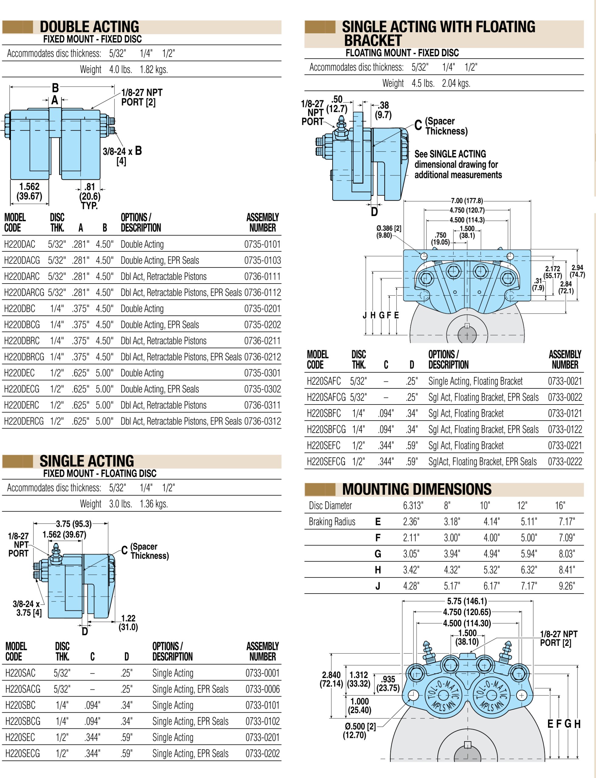 Die hydraulischen Scheibenbremsen der Serie H220 bieten ein Drehmoment von bis zu 3503 Nm (31.000 in-lb) bei einem maximalen Druck von 68,95 bar (1000 PSI). Die Serie H220 von hydraulischen Scheibenbremsen umfasst einfach- und doppeltwirkende Modelle.